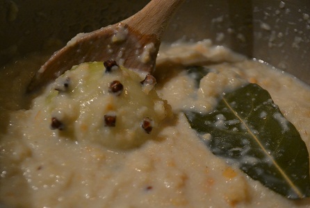 - When you’re ready to make the sauce, remove the onion, peppercorns and bay leaf from the milk and put to one side, don’t discard. Stir the breadcrumbs into the milk and add half the butter. Leave on a very low heat stirring now and then till the bread has thickened the sauce – about 15 minutes.