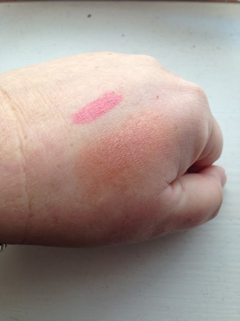 The freebie included the same cleansing water that I bought full size along with a serum, SPF 15 day cream, lipstick and cream bronze eye colour which I have swatched below. The sizes of the samples will be perfect for a weekend away, I shall save mine for my daughters hen trip, they are probably not quite big enough for a weeks holiday.